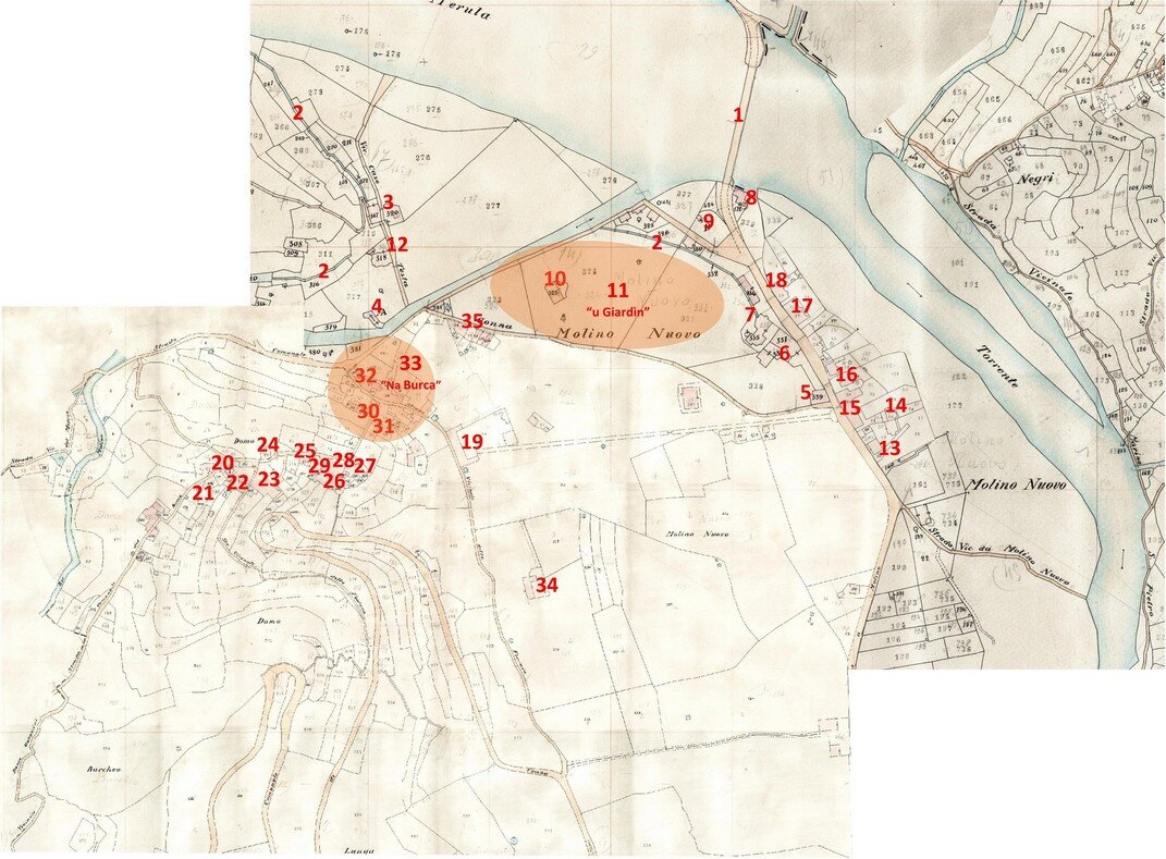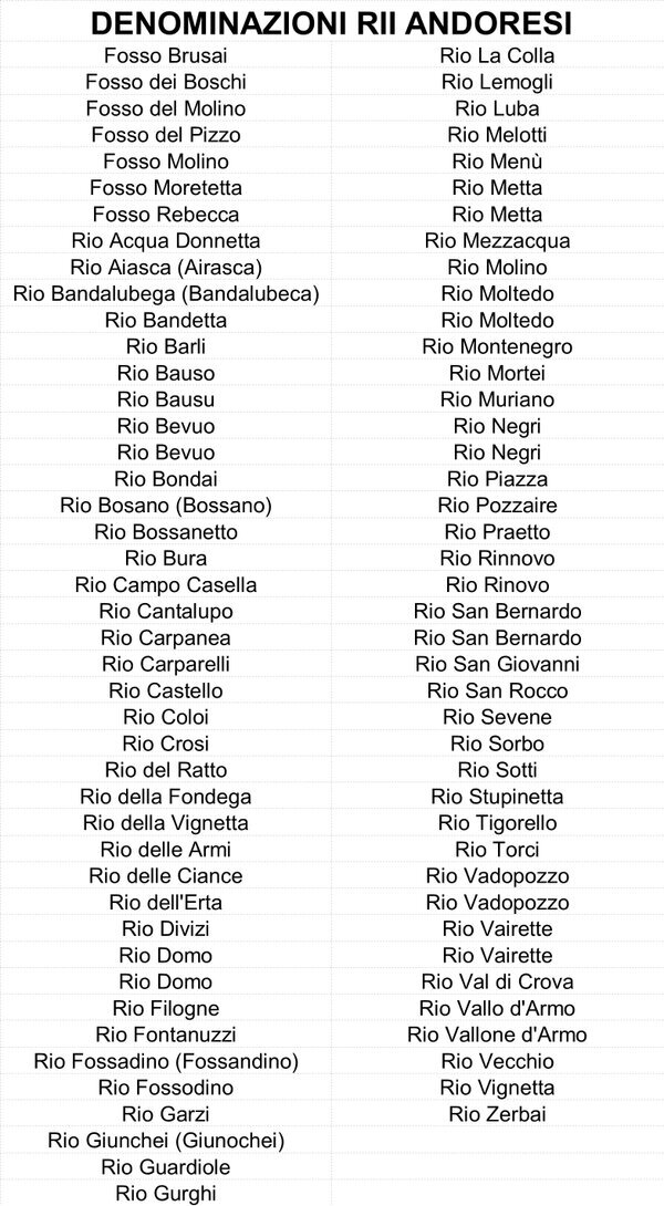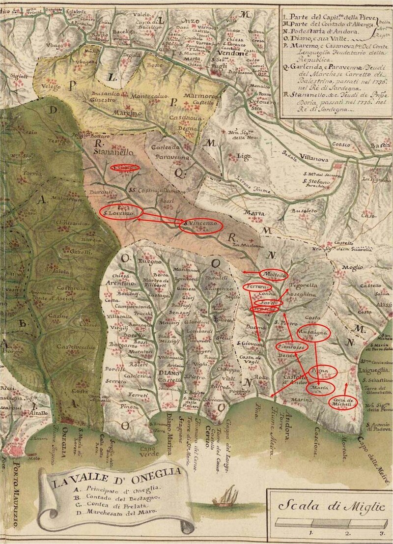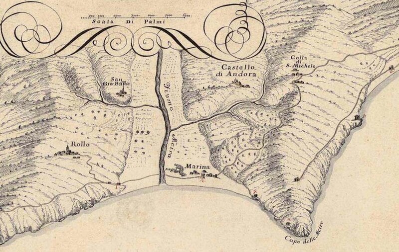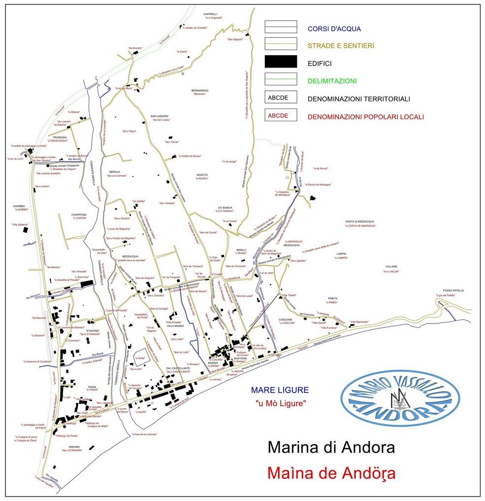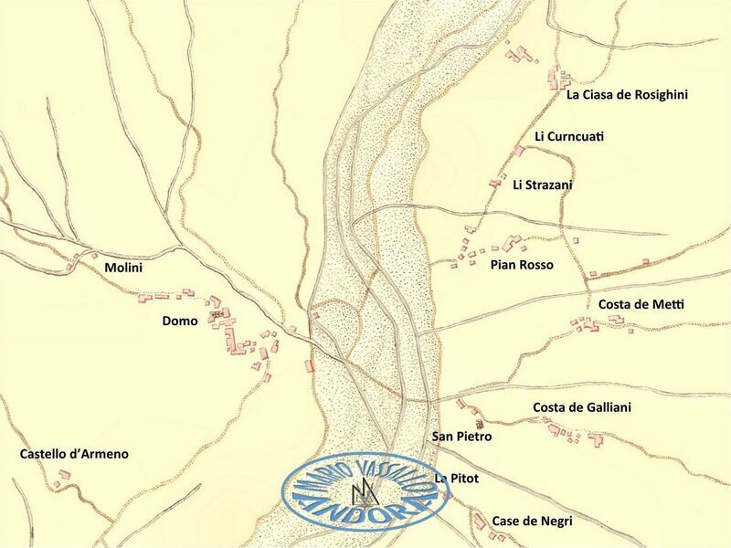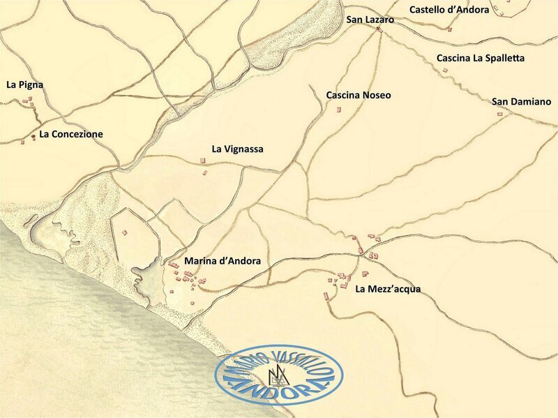 4. Il “quartiere” di Sant’Andrea, nella parte della Valle di Andora a Ponente del torrente Merula, si componeva della borgata Ferraia, sotto la Chiesa Parrocchiale (“Propositura”) di San Giovanni Battista, della borgata Duomo, sotto la Chiesa Parrocchiale (“Rettoria”) di San Pietro, delle borgate Garassini, Conna e Moltedo, sotto la Chiesa Parrocchiale (“Rettoria”) di Sant’Andrea, della borgata Barò, sotto la Chiesa Parrocchiale (“Rettoria”) di San Bartolomeo, perimetrato dal “quartiere” di Sant’Andrea, dal territorio di Diano, dal torrente Merula, dal fossato della Ferraia (che lo divideva dal “quartiere” di San Giovanni) e dal territorio di Stellanello.