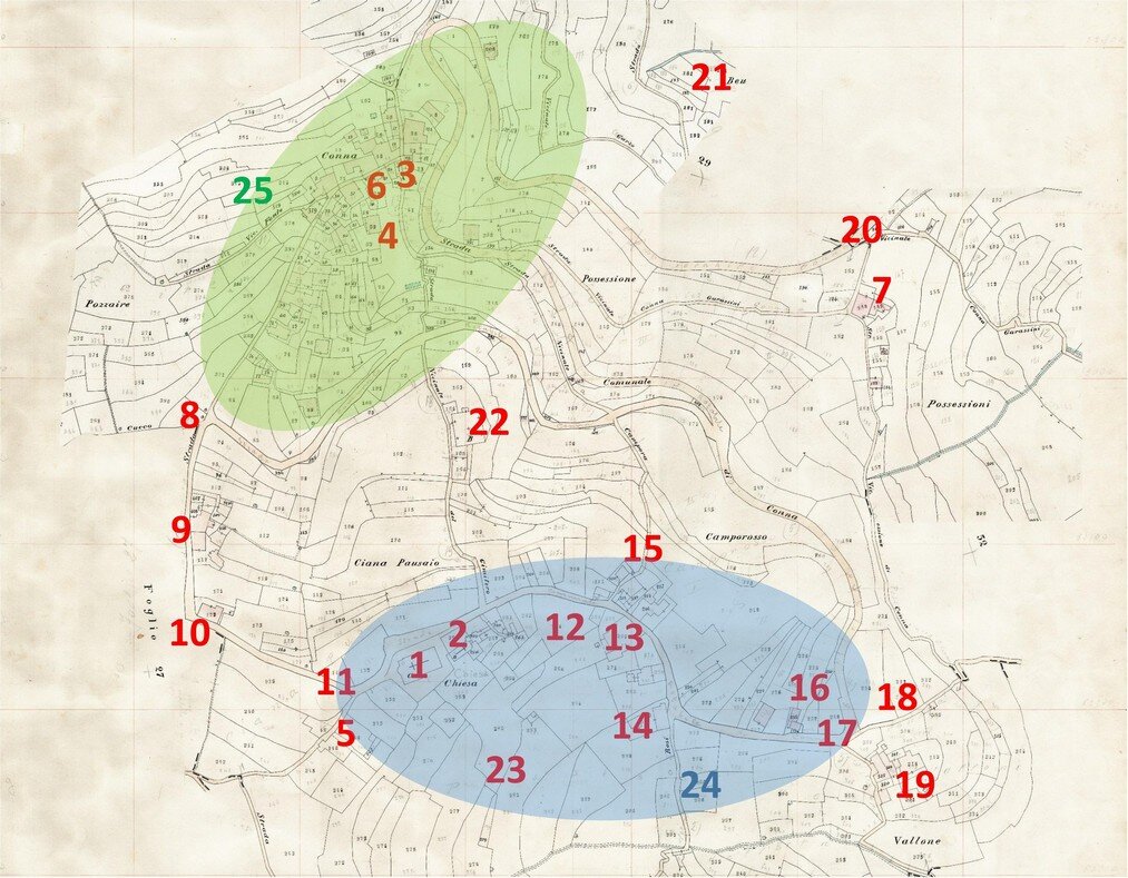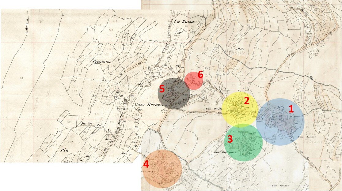 5. Il “quartiere” di San Giovanni, nella parte della Valle di Andora a Ponente del torrente Merula, si componeva delle borgate di Rollo, sotto la Chiesa Parrocchiale (“Rettoria”) della Santissima Trinità, delle borgate Confredi, e Canussi, sotto la Chiesa Parrocchiale (“Propositura”) di San Giovanni Battista, perimetrato tra la sommità e il promontorio di Capo Cervo, dai territori di Cervo e Diano), dal torrente Merula, dal mare e dal fossato della Ferraia (che lo divideva dal “quartiere” di San Giovanni e dal “quartiere” di Sant’Andrea).