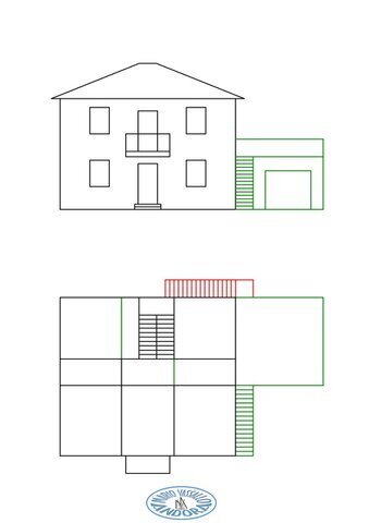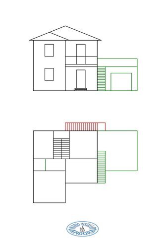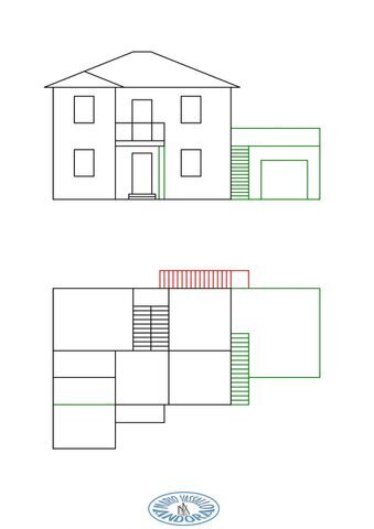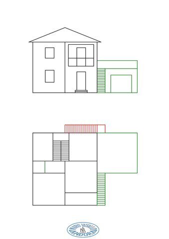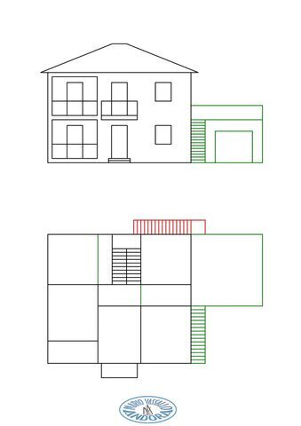 2) la forma planimetrica è rettangolare con il lato maggiore di circa ml 10 (fronte principale), in modo da poter ottenere tre ampi vani affiancati; per ragioni di praticità nella suddivisione funzionale e di eventuali collegamenti interni tra i due piani per mezzo di una scala a rampe, la stessa è realizzata in posizione centrale addossata alla parete perimetrale retrostante del fabbricato o, in alternativa, in corrispondenza di uno degli angoli formati tra le pareti perimetrali laterali e quella retrostante; solitamente il prospetto laterale è inferiore di circa ml 1 e fino alla concorrenza di 1/3 del fronte principale; il collegamento tra i vari locali interni è agevolato da un corridoio – disimpegno, il quale crea una suddivisione interna piuttosto simmetrica e la cui parte terminale definisce lo spazio dedicato al locale servizi igienici; le bucature sul fronte principale sono generalmente in numero di 6.