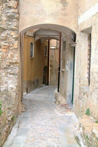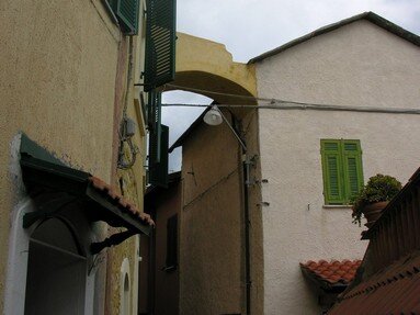 La borgata attigua, collegata alle Case Sottane da un breve tratto di strada, è detta Case Tagliaferro (…). Essa presenta uno sviluppo focalizzato radiocentrico avvolgente parziale [5l]. Infatti l’insediamento segue perfettamente la curva di livello che, attraversando la dorsale collinare, delimita - a m. 150 - il limite meridionale dell’abitato (…). Tre sono i percorsi, o meglio i caruggi che lo attraversano: il più settentrionale è la prosecuzione del viottolo che deriva dalle Case Sottane, dopo aver compiuto una brusca curva a gomito; quello centrale confluisce in un piccolo spiazzo quasi al centro della borgata; infine quello meridionale corre fra due schiere di case. Tutti e tre presentano un andamento ad arco, tipico di questo genere di insediamenti.