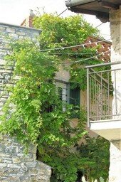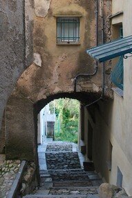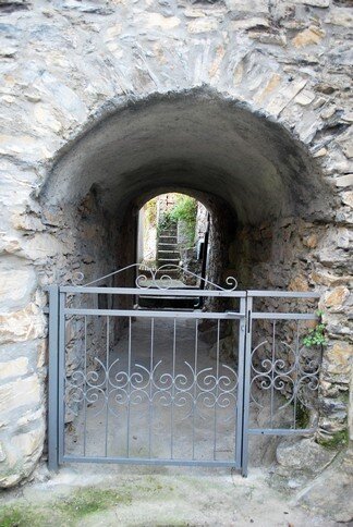 La borgata si snoda ai lati della strada omonima, caratterizzata in diversi tratti da passaggi coperti da una volta a botte, sovrastata da un vano di abitazione. Particolarmente caratteristico è quello fra le case 265-266 e quella di fronte ad esse (… Fig. 24). L’uso limitato di malta e intonaco coprenti, permette di analizzare precisamente il tessuto murario della volta, costituito da lunghi conci di pietra (calcare e arenaria), assemblati da malta e recenti interventi in cemento. Il suo innesto sui muri laterali è sottolineato da una fila di lastre sporgenti rispetto alla parete sottostante. Quella risparmiata dall’intonaco sul lato a levante (casa N. 265), è realizzata con conci sbozzati irregolarmente, ma disposti su file piuttosto regolari, con uso prevalente di pietra, e scarsissima presenza del mattone.