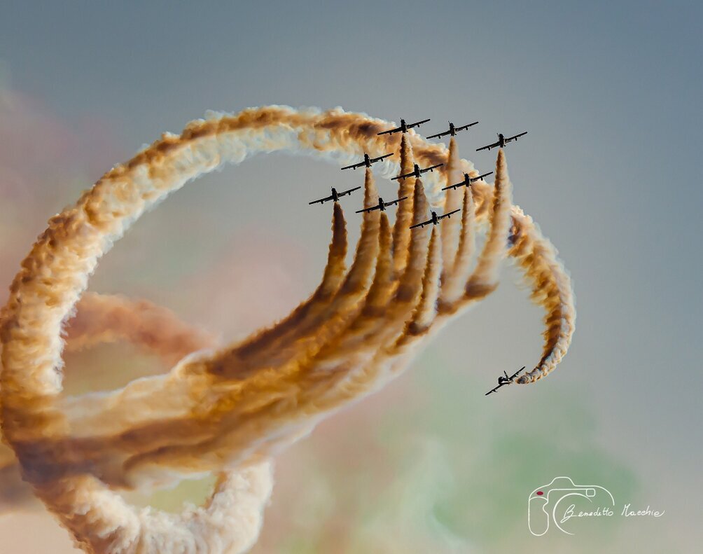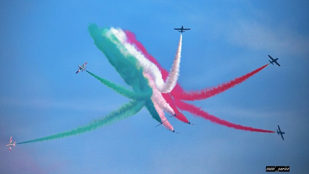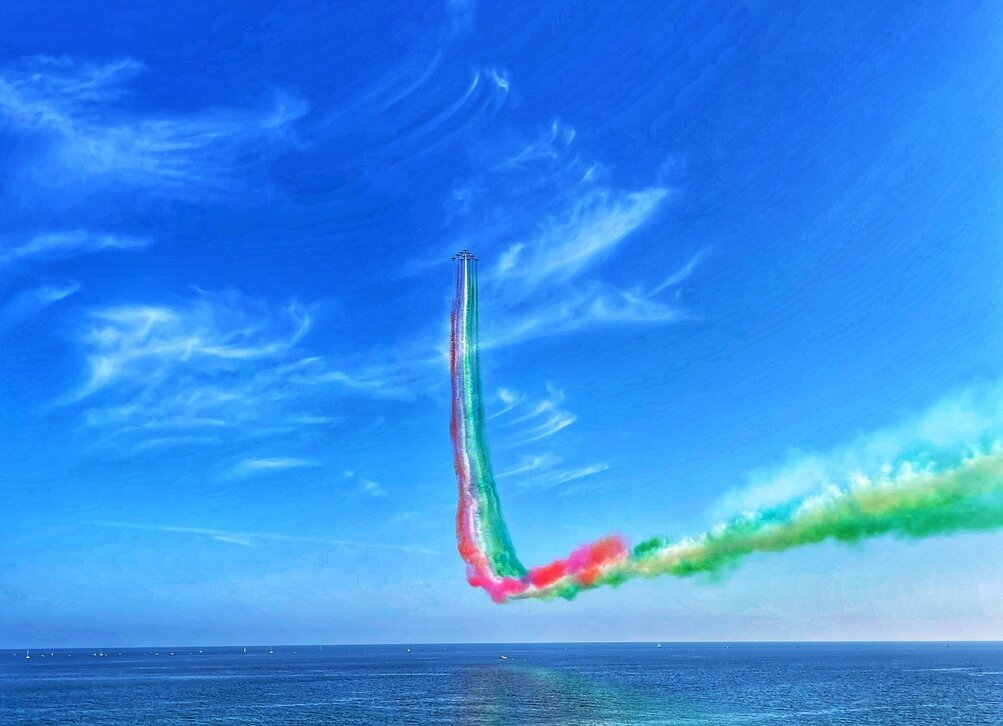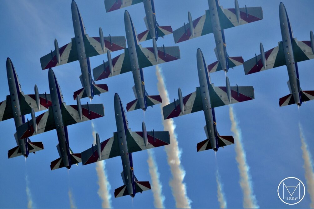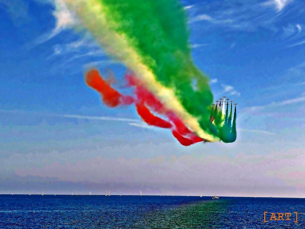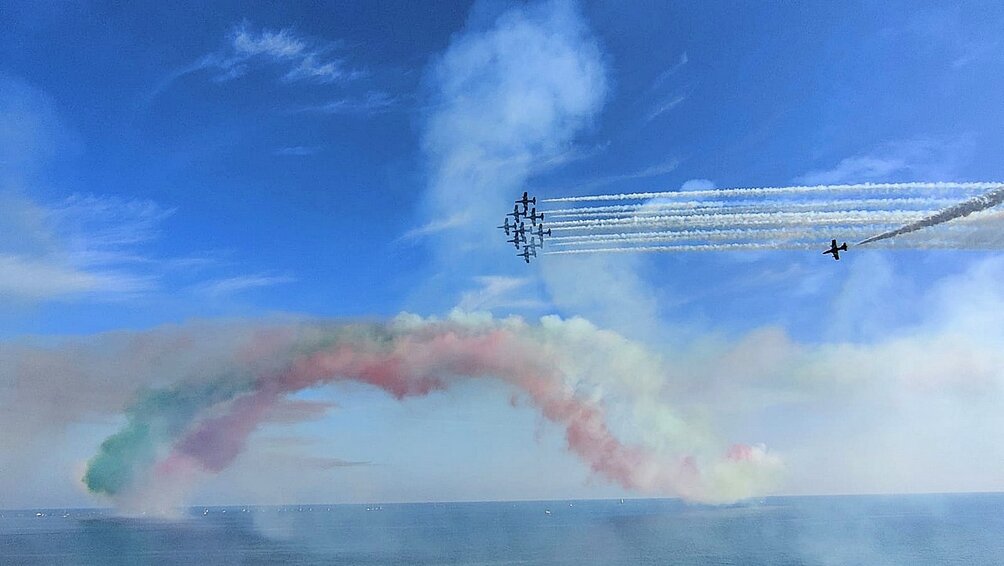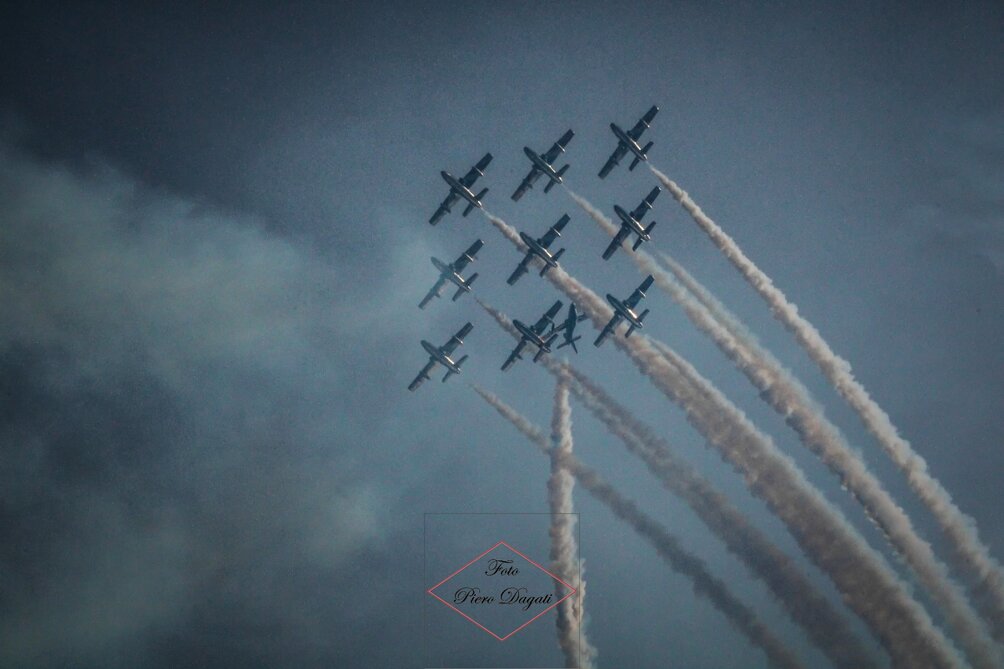 La Pattuglia Acrobatica Nazionale è nata nel 1961 in seguito alla decisione dell’Aeronautica stessa di creare un gruppo permanente per l’acrobazia aerea collettiva dei suoi piloti. La flotta schiera 10 velivoli, di cui 9 in formazione e uno solista, sono guidati a terra dal comandante Tenente Colonnello Stefano Vit che ha potuto percepire tutto il calore e l’ammirazione del pubblico che ha affollato la spiaggia ad ammirare il programma, presentato dallo speaker Riccardo Chiapolino e diffuso su tutto il litorale. È la pattuglia acrobatica più numerosa del mondo e ha un programma di volo che comprende numerose acrobazie, della durata di circa mezz’ora.