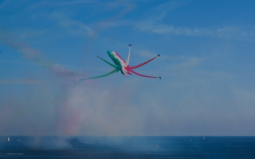 È un grande abbraccio, alla Pattuglia Acrobatica Nazionale, di 50mila persone assiepate lungo tutto il litorale, sulla passeggiata a mare, negli stabilimenti balneari, lungo la via Aurelia, chiusa al traffico. Gli spettatori, occhi al cielo, assistono all’esibizione, in questo otto di ottobre che sembra …l’otto agosto!!!!