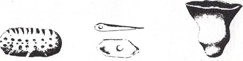 Con la selce lavorata gli uomini preistorici affrontavano animali neppure immaginabili nella nostra regione. In basso a sinistra, un manufatto in terracotta per tatuaggi.