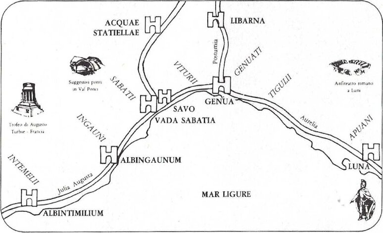 La cartina indica le popolazioni liguri e le principali strade dell'epoca romana- L 'Aurelia giungeva, oltrepassando Ventimiglia, sino alla francese Arles, la Postumia allacciava Genova a Piacenza. Quest'ultima località era inoltre collegata, da una terza arteria, a vado.
