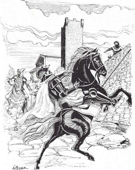 L'imperatore non dovette ripetere l'invito. Aleramo balzò in groppa ad un morello e spari a spron battuto, deciso a donare ad Alasia un territorio degno di lei. Galoppò, galoppò senza tregua verso l'interno, e una sola volta si trovò in imbarazzo, quando lo stallone perse un ferro. Chiese febbrilmente di un maniscalco, ma senza fortuna; cercò almeno un martello perdendo altro tempo prezioso, ma non ebbe maggior successo; finalmente trovò un mezzo mattone e con quello inchiodò il ferro …