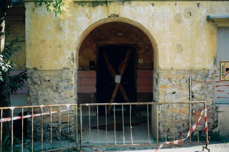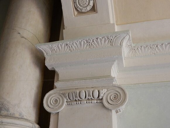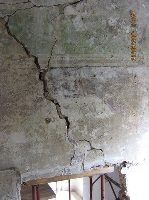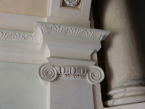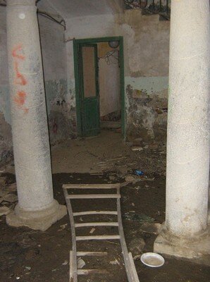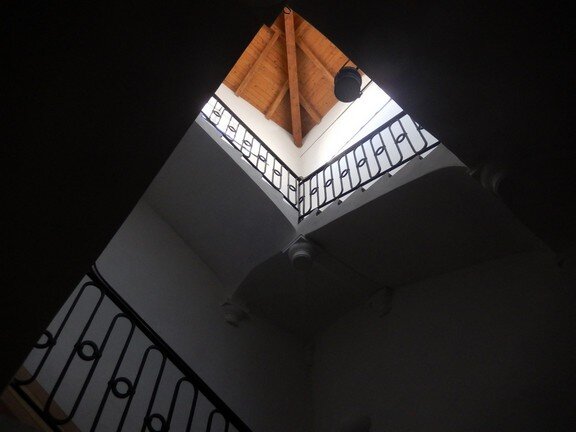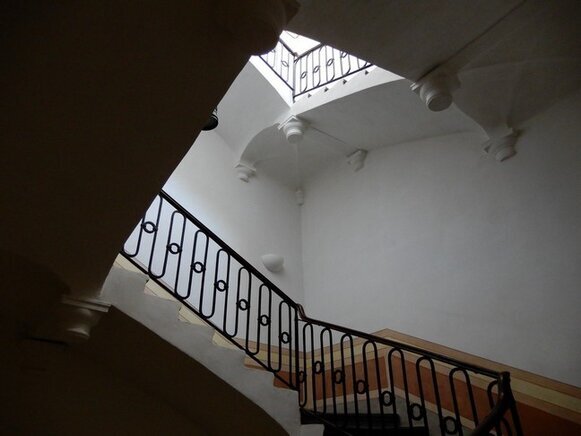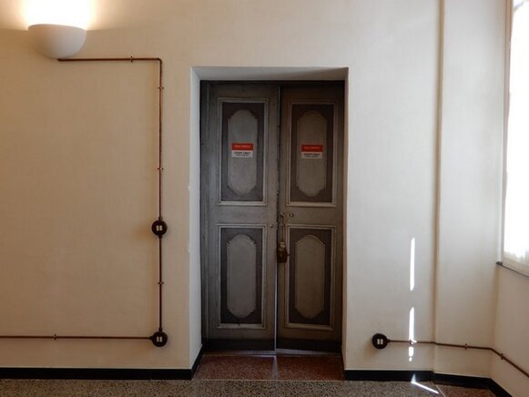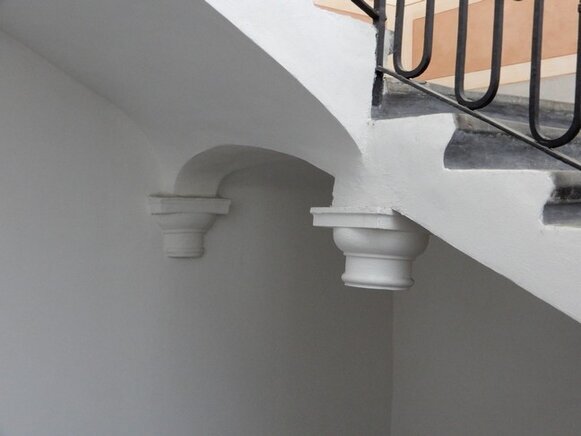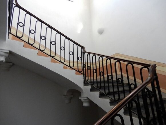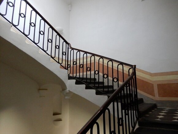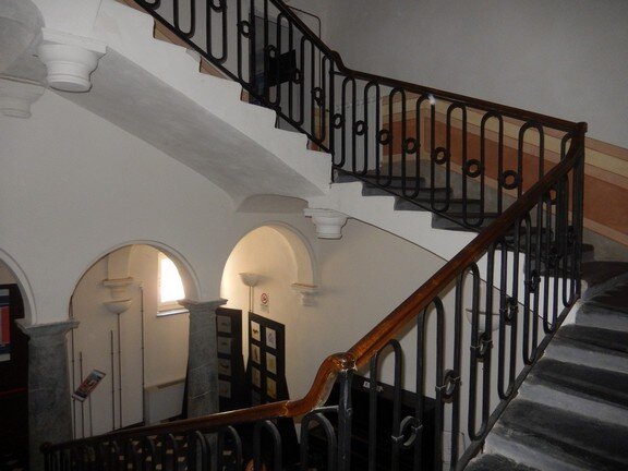 La scalinata di accesso (con gradini in ardesia, consumati dai passi di centinaia di bambini, che nel periodo in cui il palazzo era una colonia e dopo quando è diventata scuola, hanno camminato lungo le scale, una volta percorse solo dai nobili della famiglia Tagliaferro), conduce al primo piano.