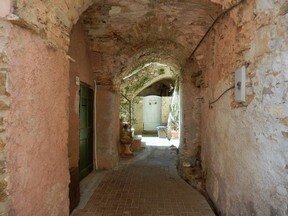 La seconda entrata di questa casa è sormontata da un bassorilievo recante l’immagine della Vergine in trono col Bambino; è circondato da una cornice ad intonaco, con incisa la data 1793 (Fig. 46). E’ impossibile dire con esattezza se tale termine cronologico vada riferito effettivamente ad un restauro di fine ‘700 o sia da attribuirsi ad un intervento più recente, che ha riprodotto sull’intonaco una data scolpita precedentemente sulla pietra e quindi riferibile all’esecuzione del bassorilievo suddetto. Un soggetto analogo è presente in un portale di Taggia (Fig.46a), la cui iscrizione riporta la data 1760. Elemento, questo, che ci fa pensare che anche la Maestà del Duomo sia del XVIII secolo.