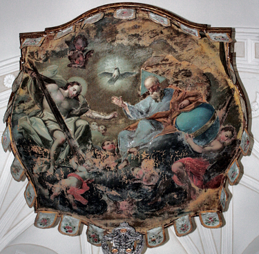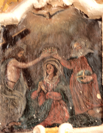 Sul soffitto troviamo un dipinto raffigurante la Trinità con la Madonna incoronata: anche in questo caso la foto del 2000 mostra segni di deterioramento mentre oggi l’immagine appare in buono stato.