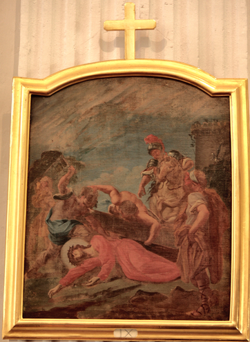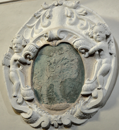 Dietro l’altare: Tempera su tavola recante la scritta “OLEUM INFORMORUM” (sportello del tabernacolo dell’Olio Santo), inizio sec. XVIII.