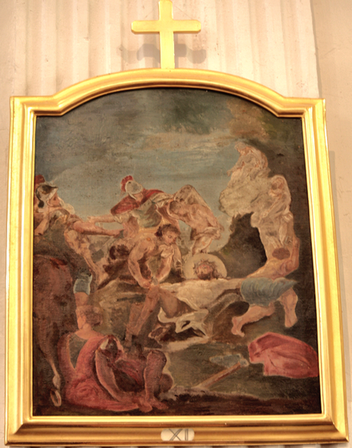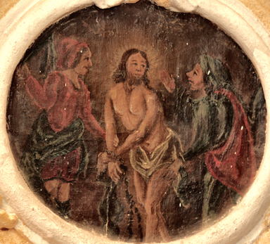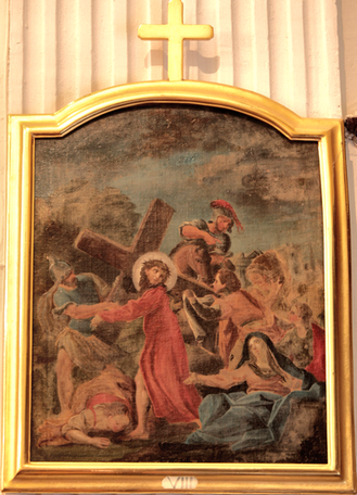 Nella prima immagine, Gesù flagellato (parete sinistra, basso); nellaseconda immagine, Gesù sale al Calvario (parete destra, medio).