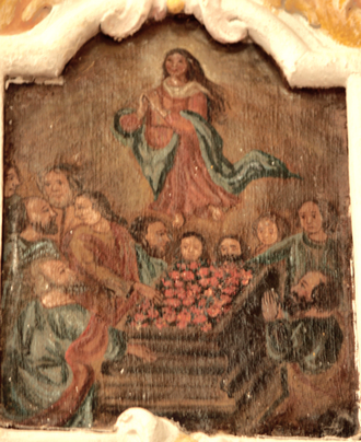 Sugli stipiti della nicchia ecco i 14 misteri del rosario, dipinti da due pittori (dipinti a olio su tela del sec XVII, restaurati nel 1998).
