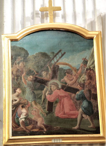 Sulle lesene sono poste 14 tavole con le immagini della Via Crucis, opera di bottega ligure (olio su tela con cornice dorata) della prima metà del sec XVIII, restaurate negli anni ’80 a Genova.