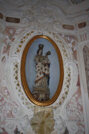 Un’altra nicchia contiene una statua lignea della Madonna Assunta con Angeli adoranti, opera di bottega ligure di fine XVII – inizio XIX sec.