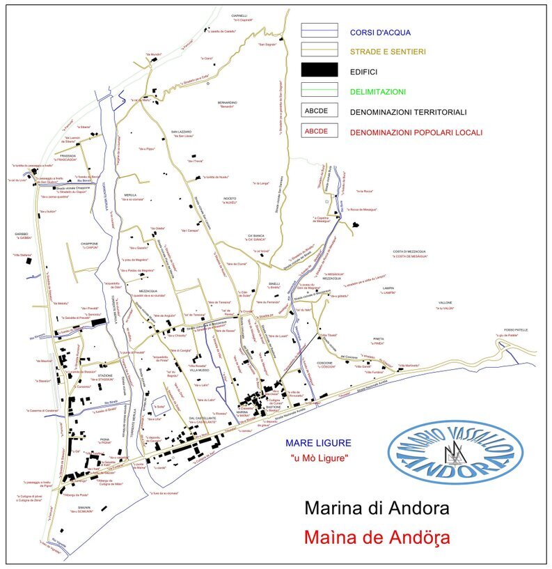 Facciamo un paragone con l’Andora di oggi, considerando tutta la distesa di territorio con questi confini: a sud il cavalcavia della via Aurelia, a est l’argine destro del Torrente Merula, a ovest una linea passante per via del Poggio e parallela al Torrente Merula; prolunghiamo la delimitazione di questa striscia verso nord, verso Molino Nuovo.