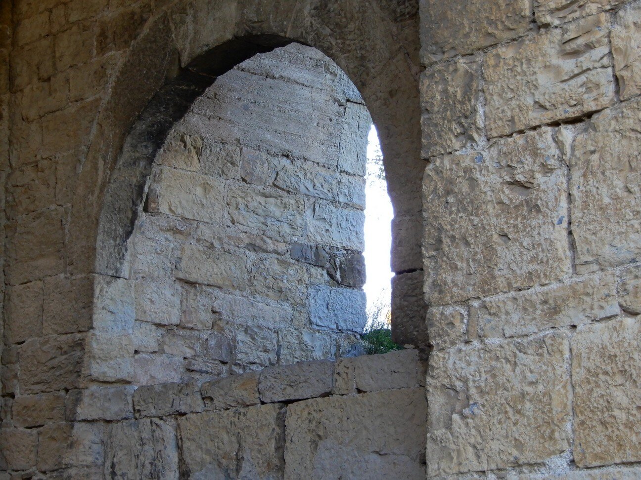 L’accesso al primo piano della torre avveniva con scala in legno attraverso le due finestre che si aprono sui lati sud e est e che riprendono lo stesso motivo dell’arco ogivale della porta: definito da massi perfettamente squadrati e aderenti quasi senza legante in vista verso l’esterno.